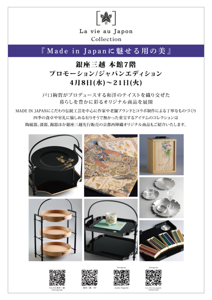 お知らせ、桂店出展のお知らせ Posted on 2026年4月7日 by oku 07 4月 戸口絢賀さんがプロデュースするLa vie au Japon COllectionに出展させていただきます。 お近くにお越しの際は、ぜひお立ち寄りくださいませ。 開催日時:2026年4月8日(水) ~ 2026年4月21 […] 続きを読む →
